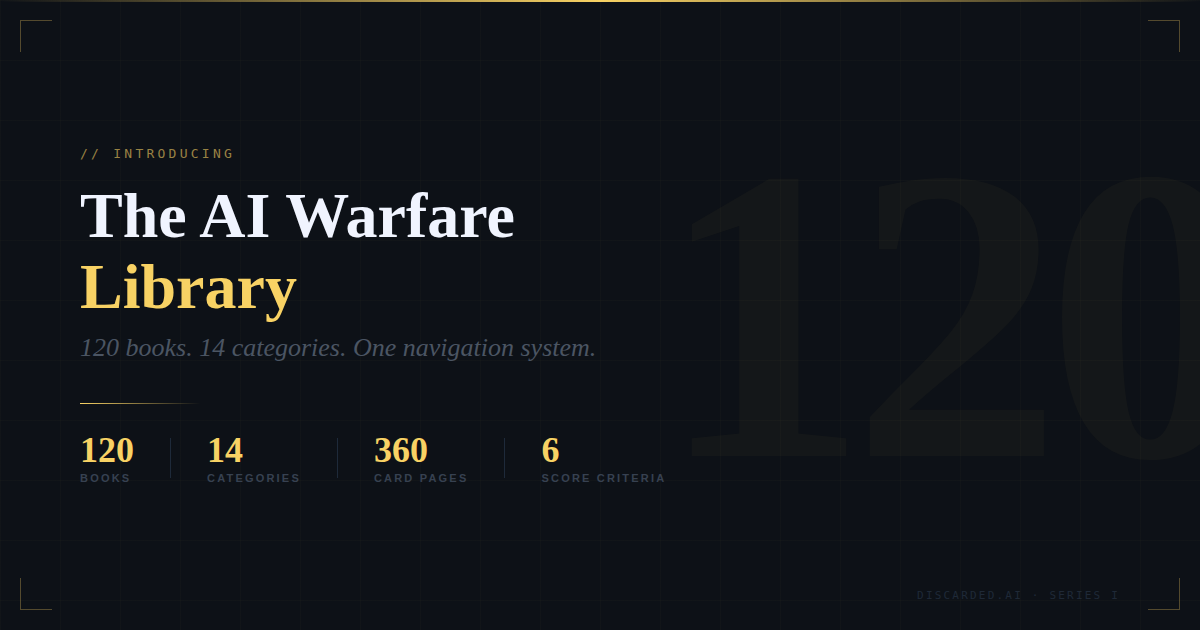 120 books. Every significant work on autonomous weapons, drone warfare, cyber operations, great power competition, AI safety, and the ethics of machine-speed conflict — curated, scored, annotated, and connected to each other.
