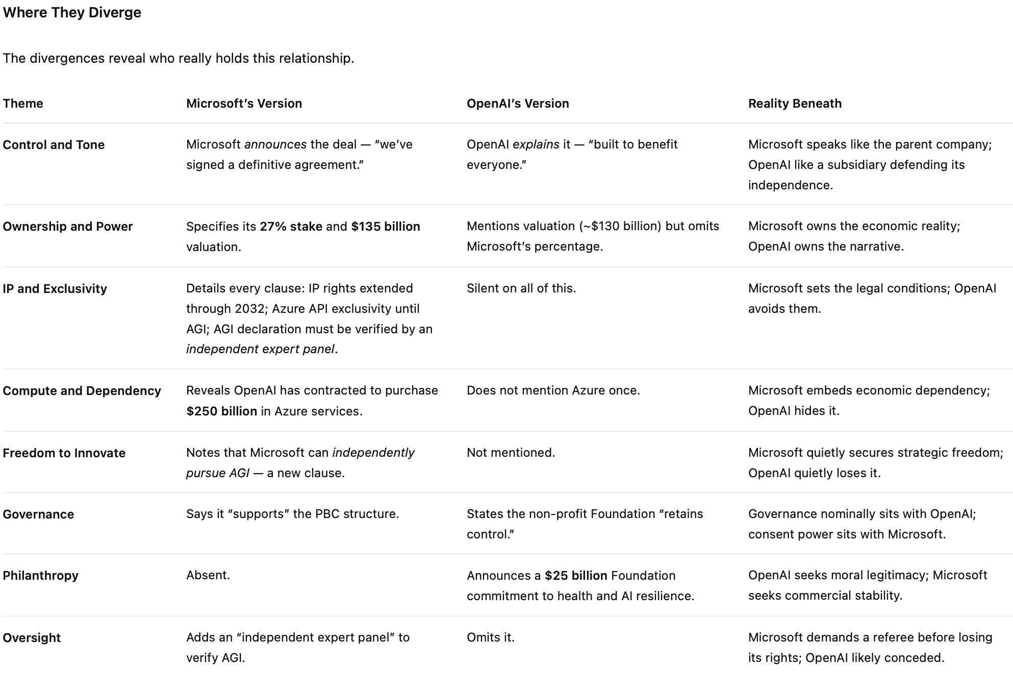 Microsoft and OpenAI published two statements on the same day announcing “the next chapter” of their partnership. On paper, they describe the same deal. In tone, detail, and intent they describe very different worlds.