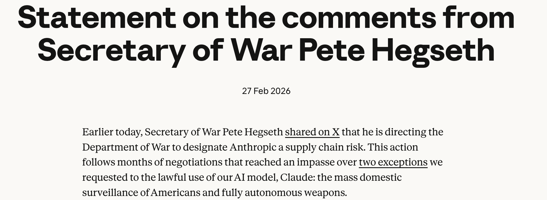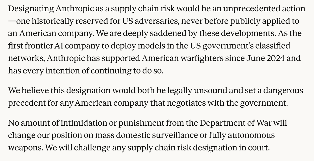 Yesterday I published the timeline of what happened to Anthropic last week. Today I want to look at what Anthropic said in response - because the statement they published on Friday tells you more about their situation than anything Hegseth posted on X.